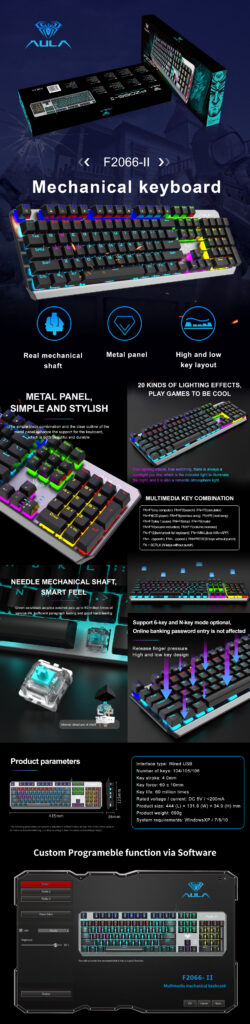 • AULA F2066-II Mechanical Gaming Keyboard combines durable mechanical switches, vibrant RGB backlighting, accurate anti-ghosting, and solid metal build — giving you performance-ready control for gaming, work, and everyday computing.